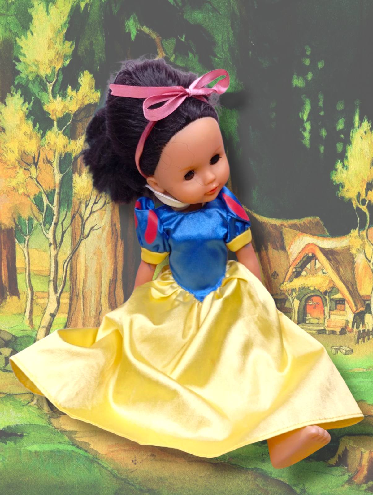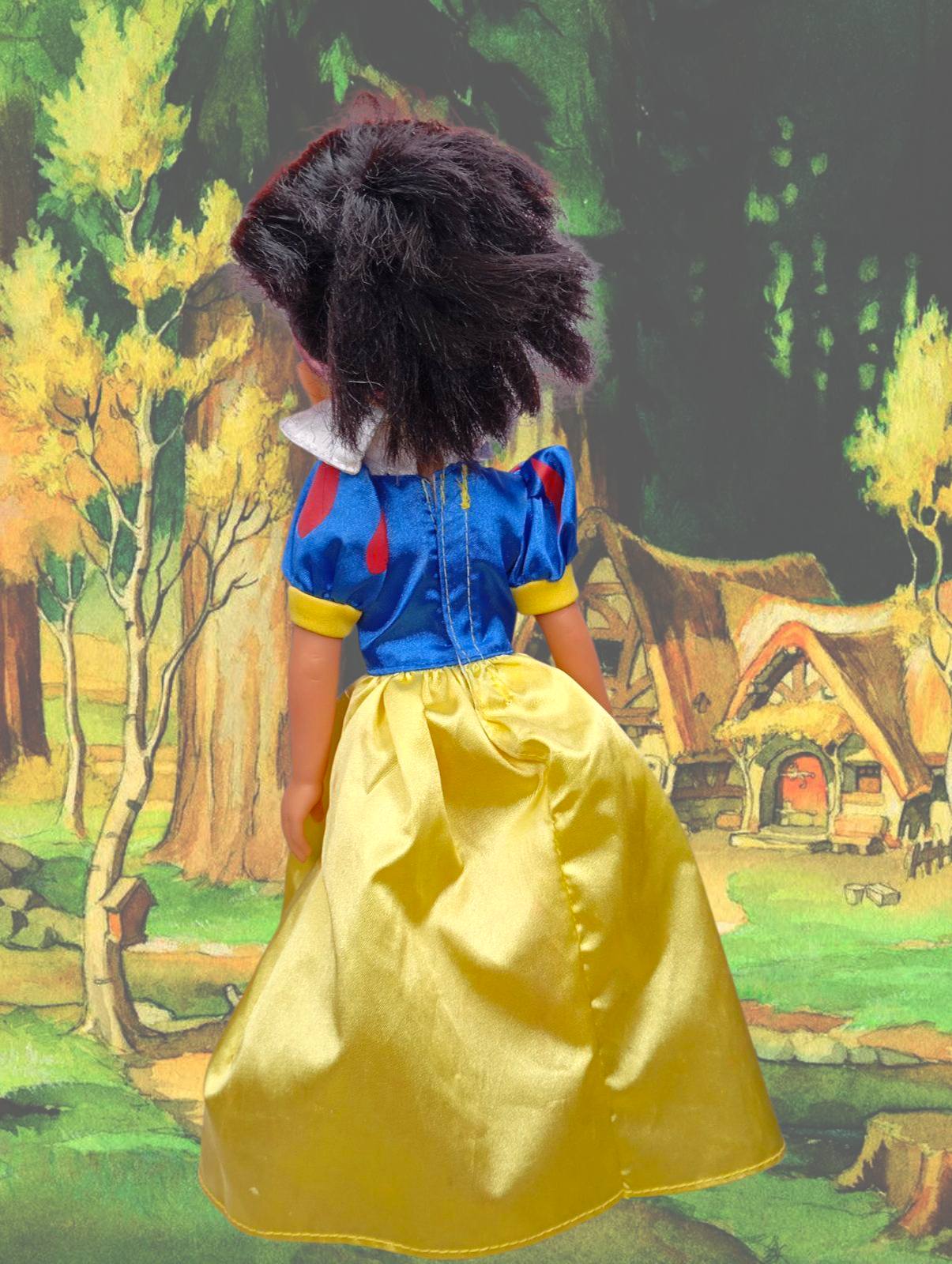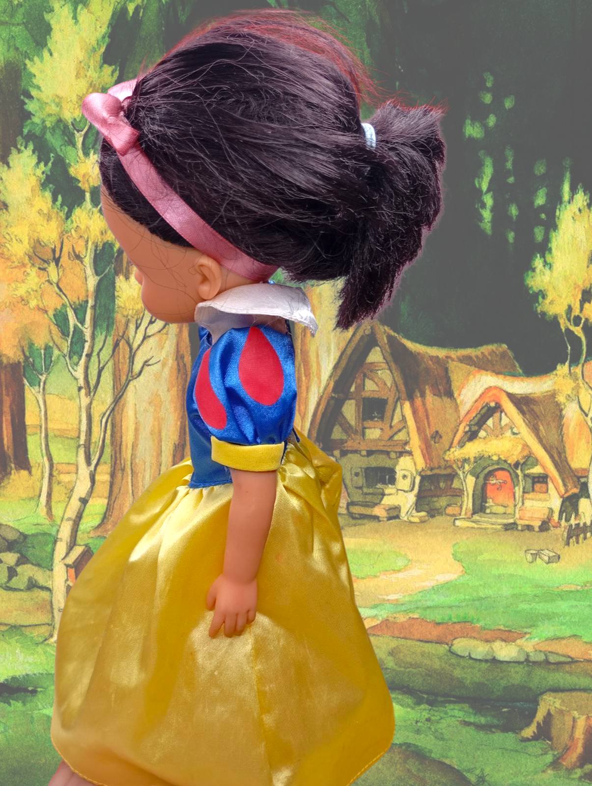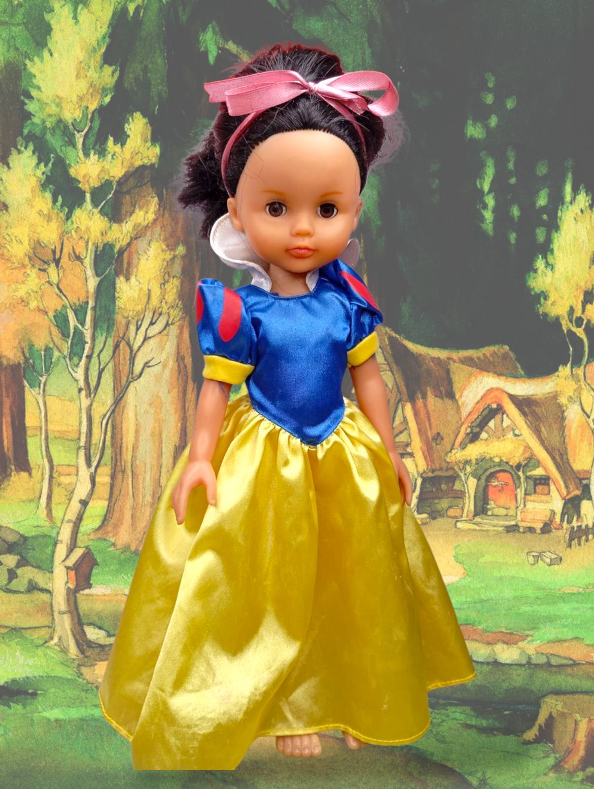 Παιδική κούκλα εμπνευσμένη από τη Χιονάτη, με υφασμάτινο φόρεμα σε μπλε και κίτρινο χρώμα. Το ύψος της είναι περίπου 30 εκ. Στην πλάτη γράφει "MADE IN CHINA" και έχει τον κωδικό H1427.