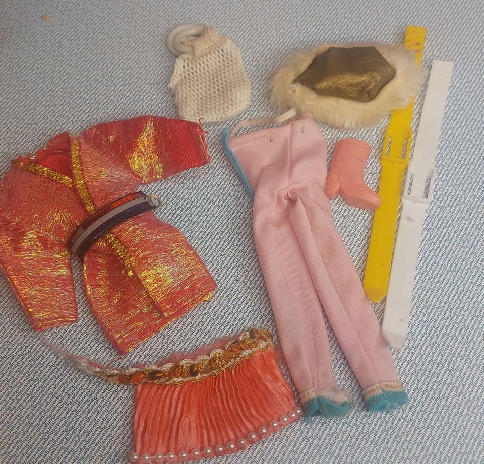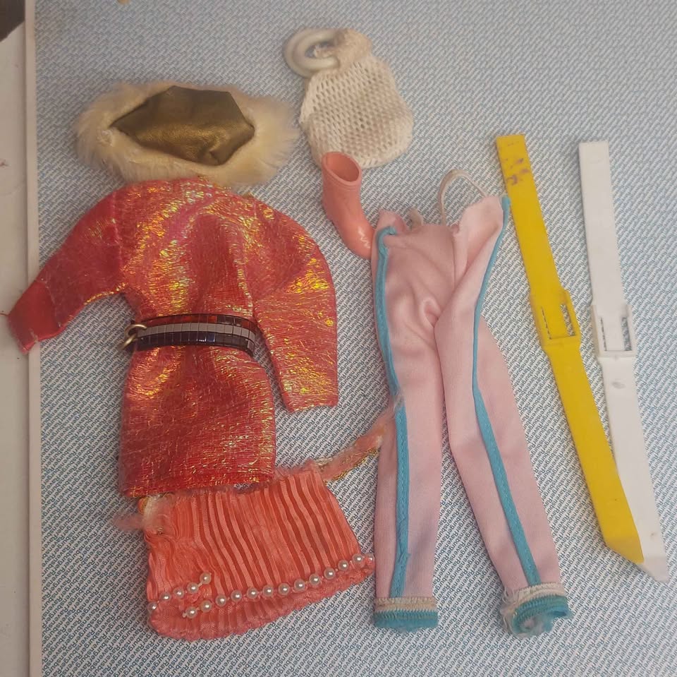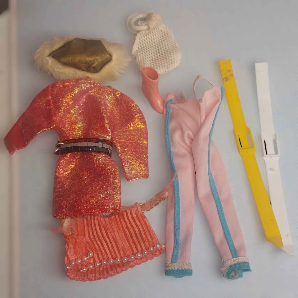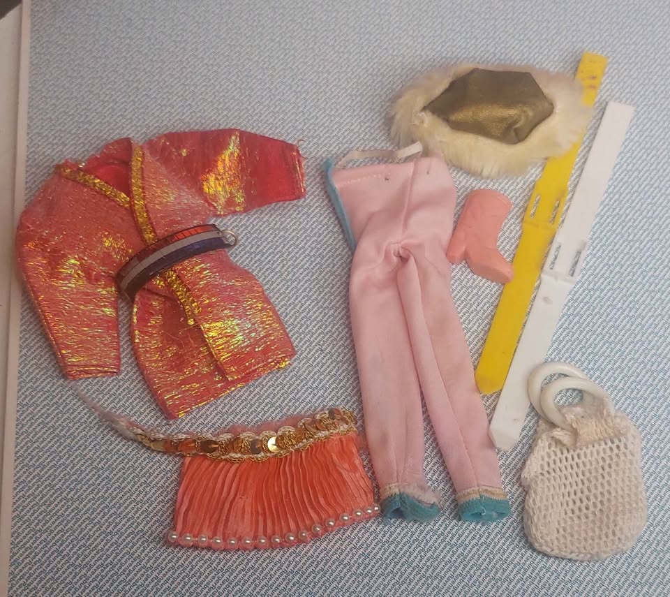 Aυθεντικά ρούχα και αξεσουάρ της κούκλας Bibibo από τη δεκαετία του ’80. Το σετ περιλαμβάνει διάφορα κομμάτια σε καλή έως μέτρια κατάσταση, ιδανικά για συλλέκτες ή για συμπλήρωση γκαρνταρόμπας. 👗 Περιλαμβάνονται: Ροζ ιριδίζον σακάκι με χρυσή λεπτομέρεια Ροζ παντελόνι με μπλε τελειώματα Φούστα με πορτοκαλί πλισέ ύφασμα, πούλιες και περλίτσες Ροζ μπότα (1 τεμ.) Λευκή διχτυωτή τσάντα Καπέλο με γούνα (σε χρυσό-λευκό) 2 αξεσουάρ για σκι (λευκο & κίτρινο)