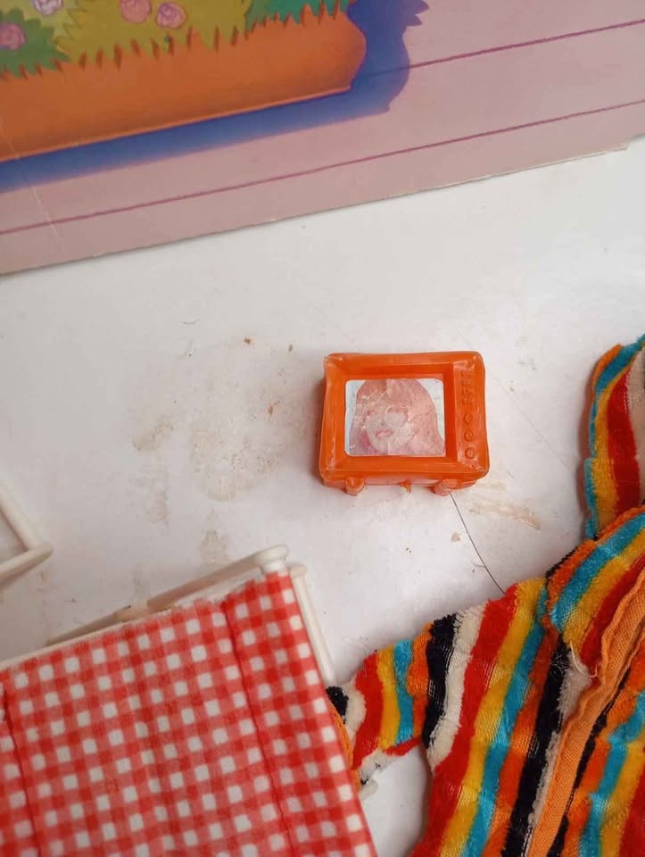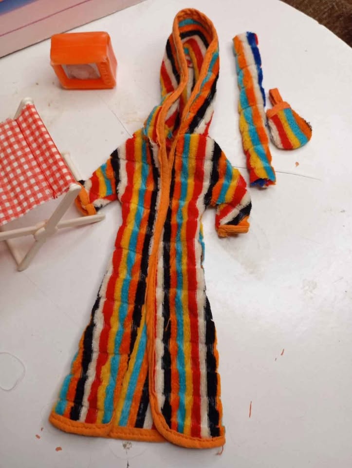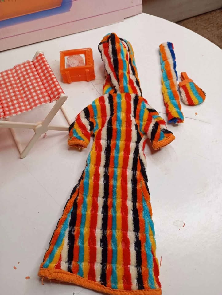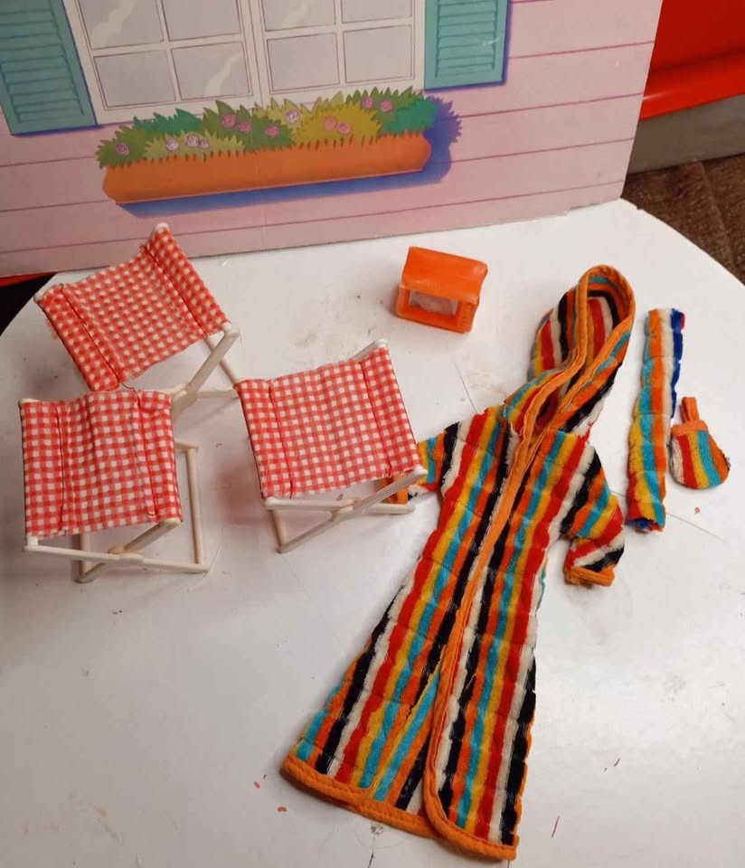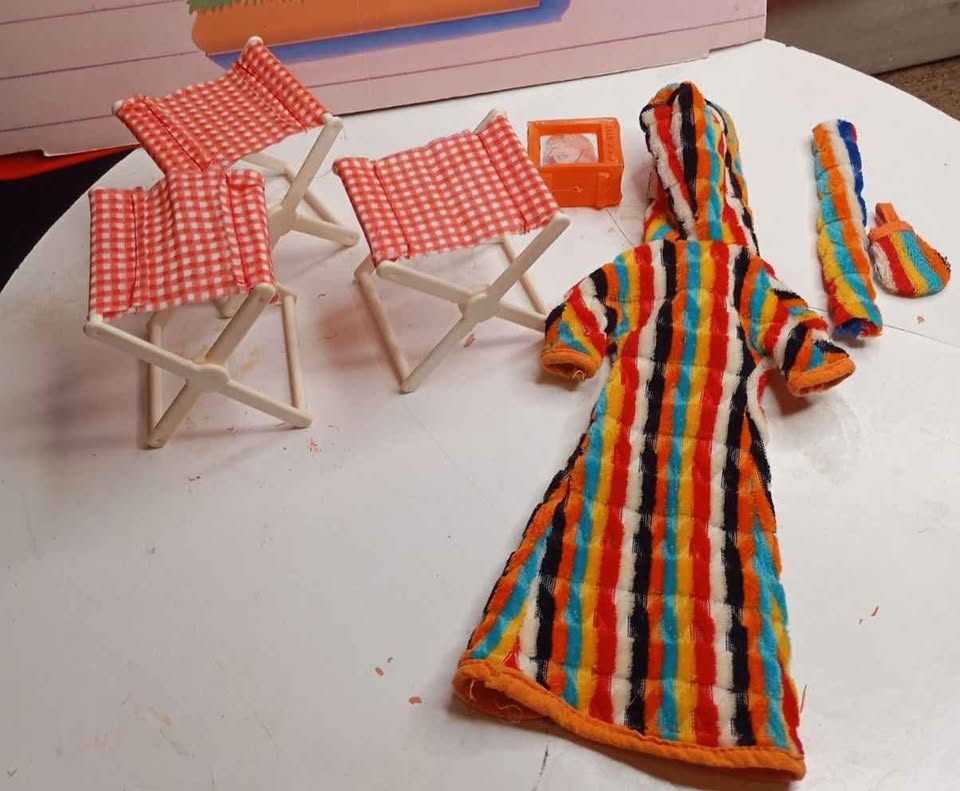 Αποτελείται από αυθεντικό μπουρνούζι Bibi-bo "Μύκονος", με χαρακτηριστικές ρίγες σε πορτοκαλί, μπλε, κόκκινο και μαύρο μαζί με το σπάνιο τσαντάκι της σειράς και μια ζώνη.Μαζί έχει  3 καρεκλάκια κάμπινγκ με καρό ύφασμα και πλαστική τηλεόραση εποχής.Όλα τα αντικείμενα είναι vintage, από τη δεκαετία του '80, και σε πολύ καλή κατάσταση για την ηλικία τους.Ιδανικά για συλλέκτες και λάτρεις της Bibi-bo.