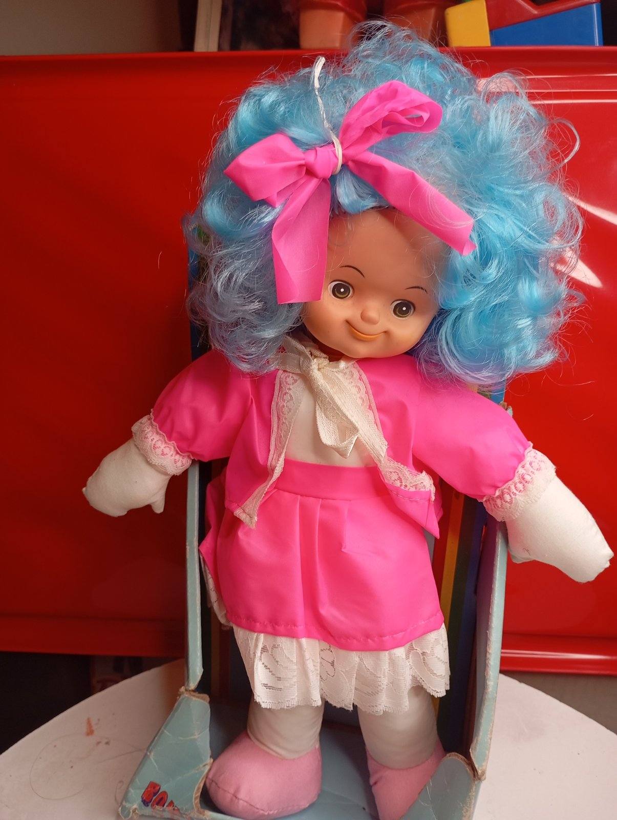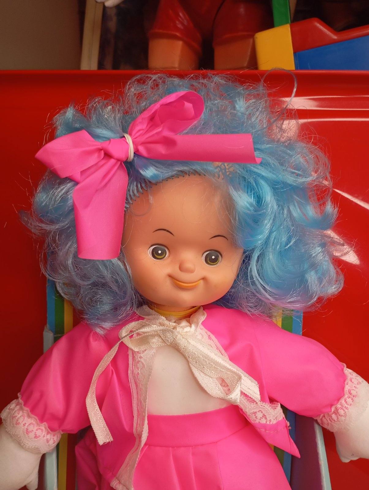 Πανέμορφη πάνινη κούκλα Bonita Show με μπλε μαλλιά και ροζ σύνολο με δαντέλα. Η κούκλα διατηρείται σε πολύ καλή κατάσταση και συνοδεύεται από το αυθεντικό της κουτί (με λιγες φθορές λόγω χρόνου). Έχει γλυκιά έκφραση, έντονα χρώματα και χαρούμενο στυλ.
