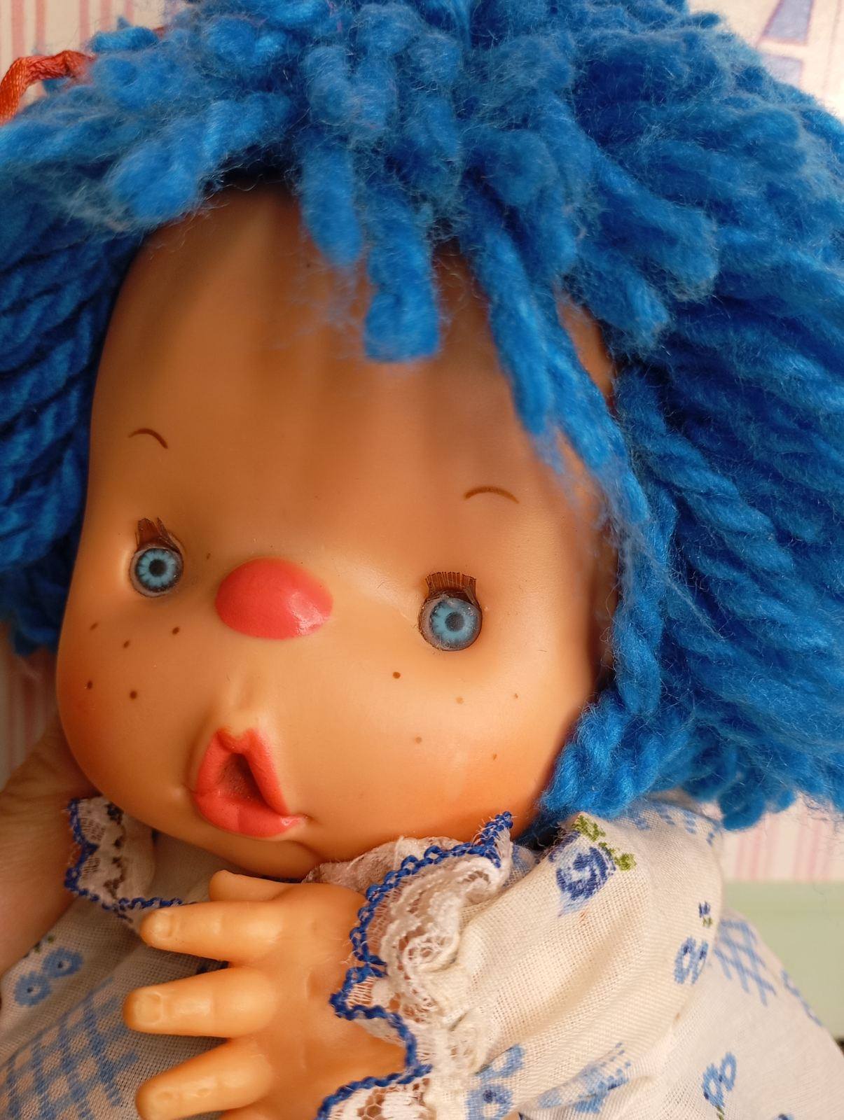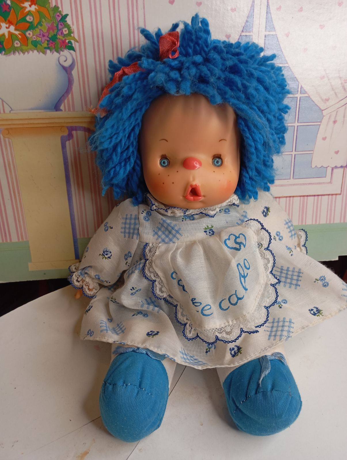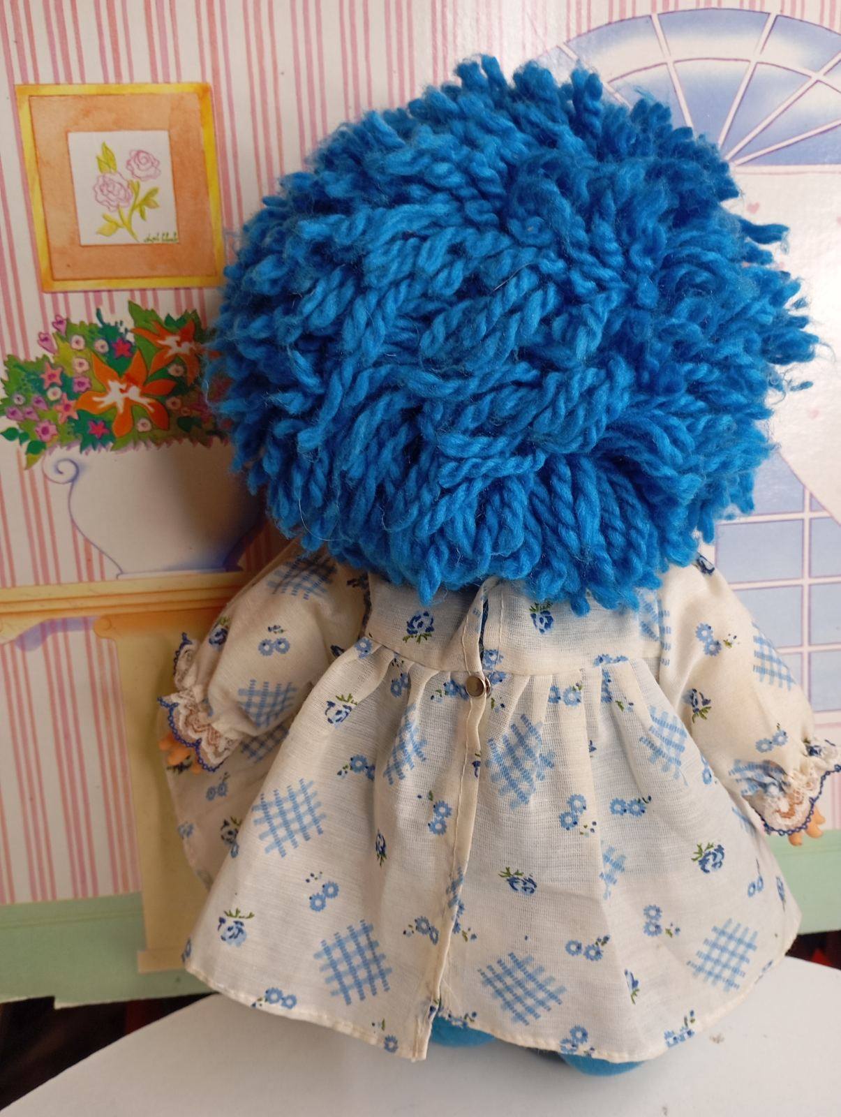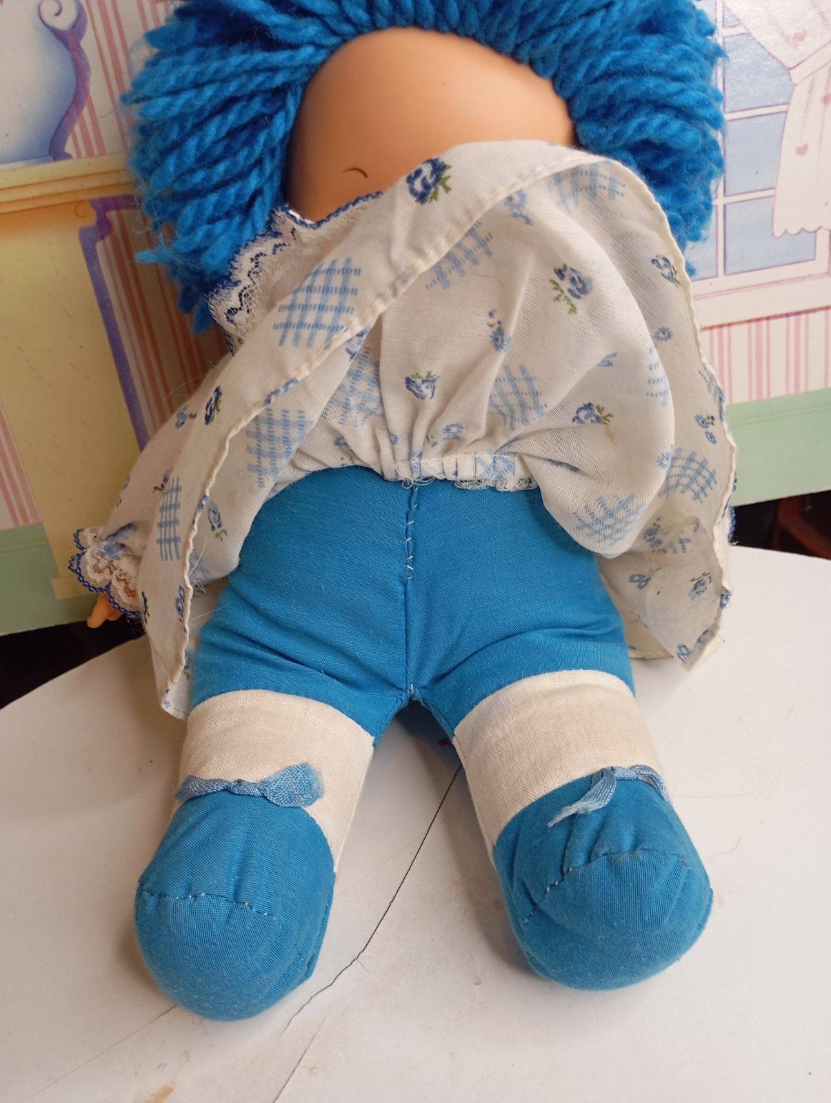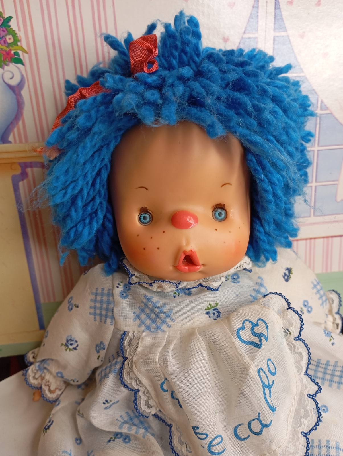 Μπλε πανέμορφη παταπούφα "η κουκλα με την ζεστη καρδιά " της el greco της δεκαετίας του 80 στα 32cm το μεσαίο μέγεθος.