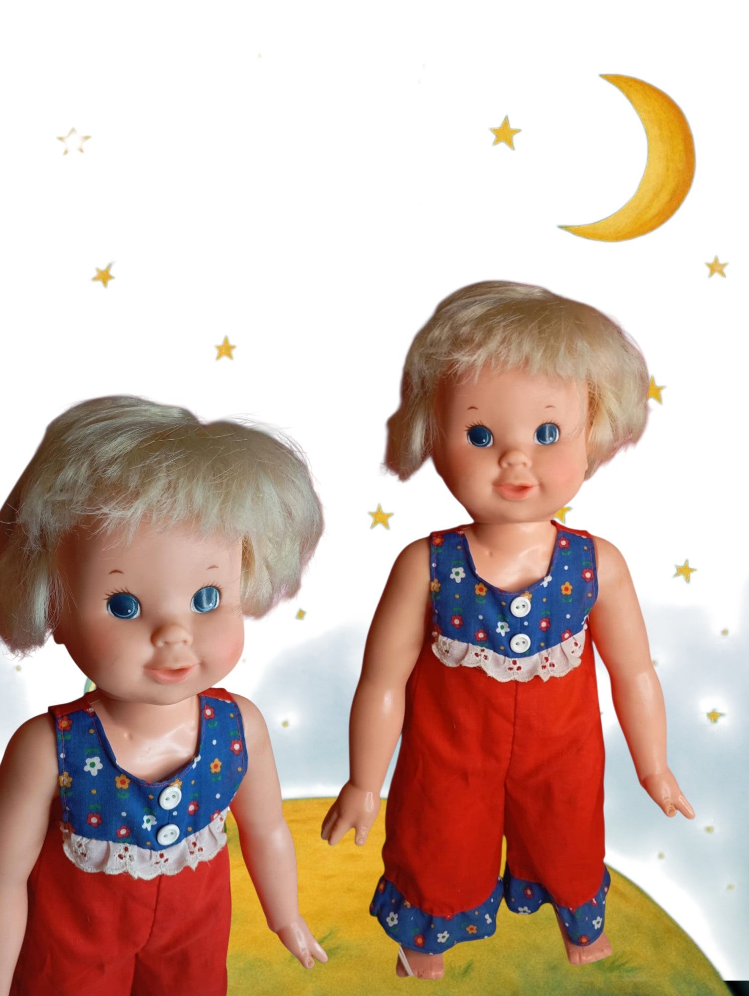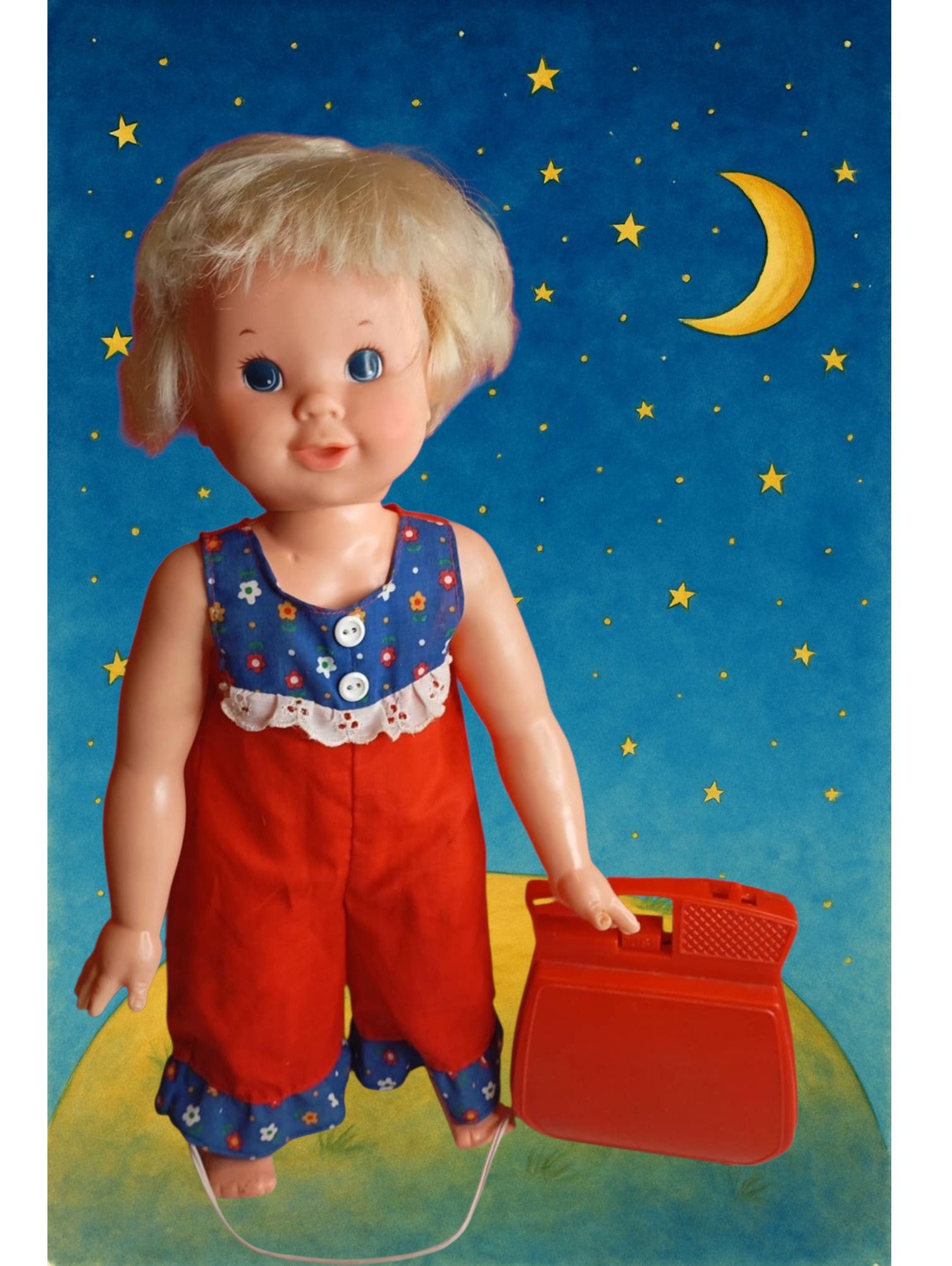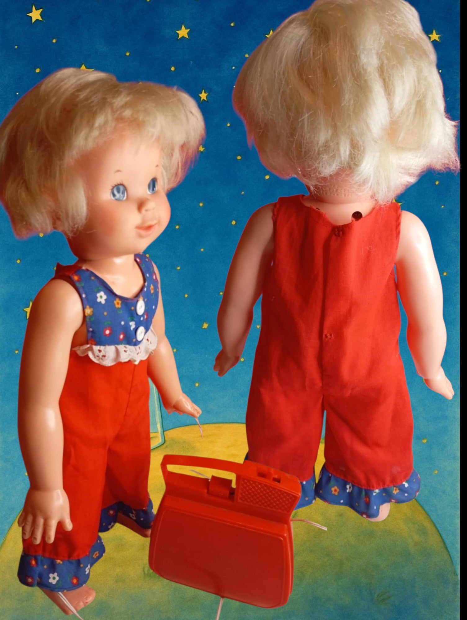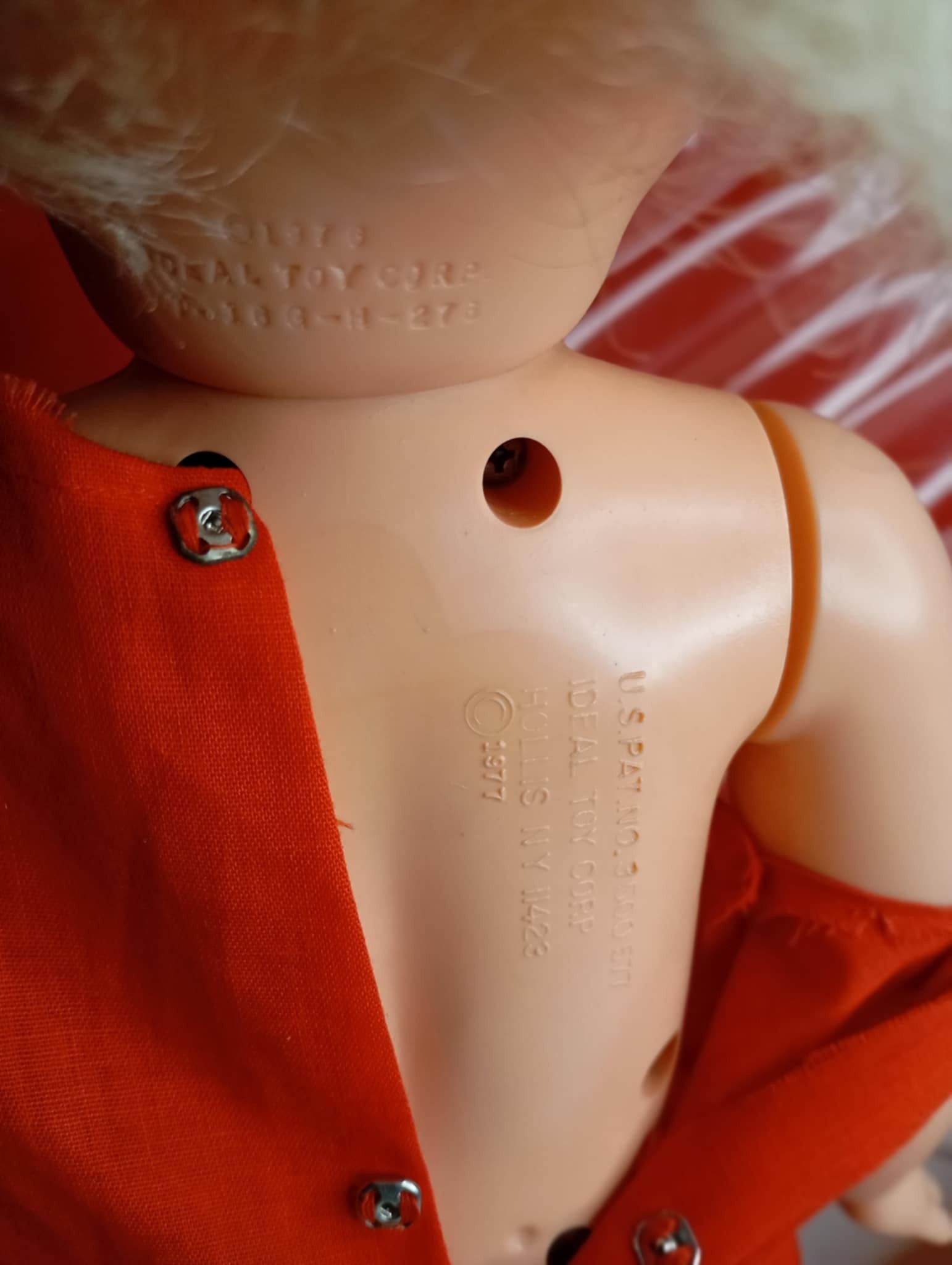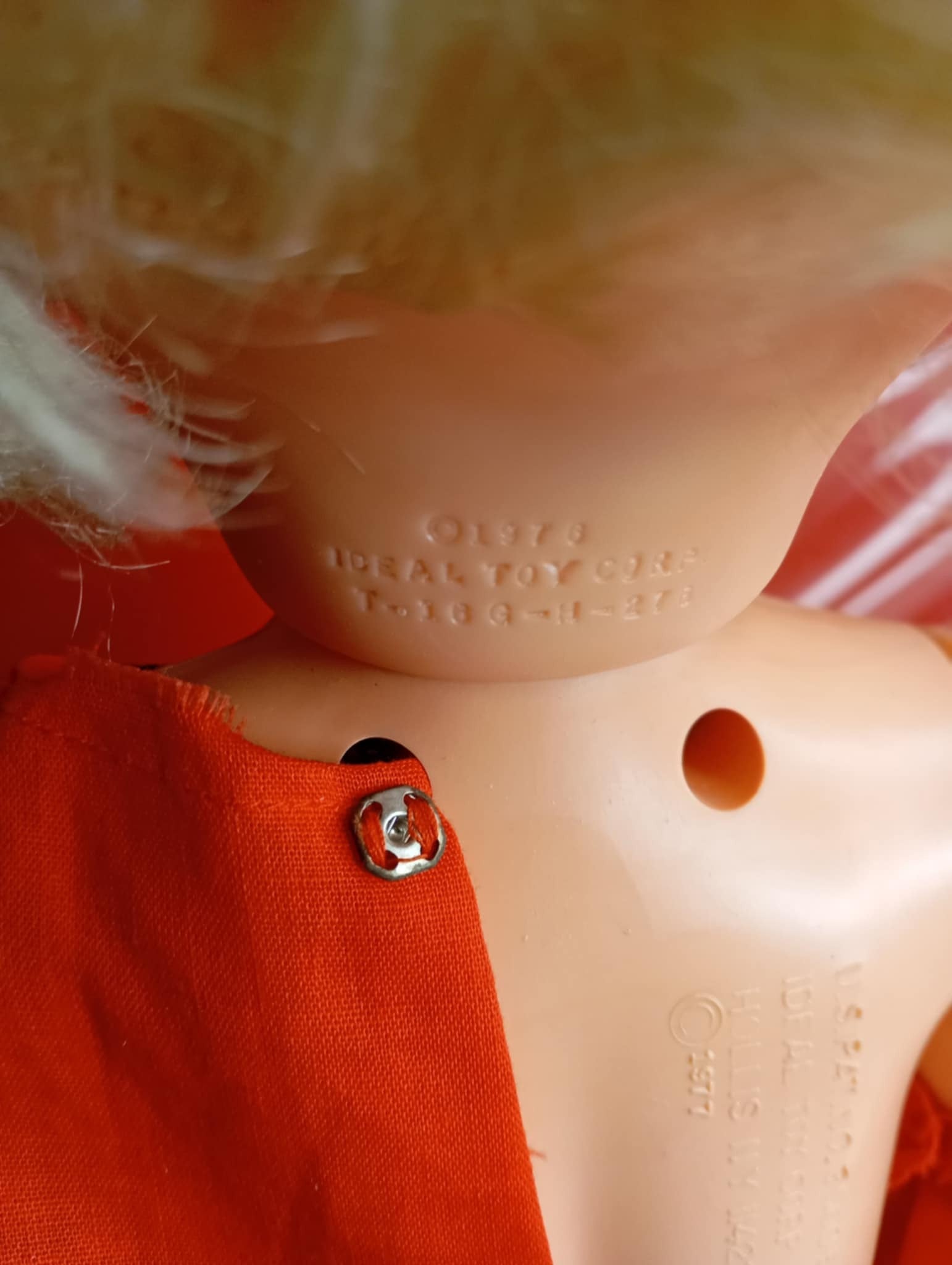 Η Tippy Tumbles, μια γλυκιά κούκλα του 1977 από την Ideal Toy Corp, με μπλε μάτια, ξανθά μαλλιά και το αυθεντικό της ρούχο.