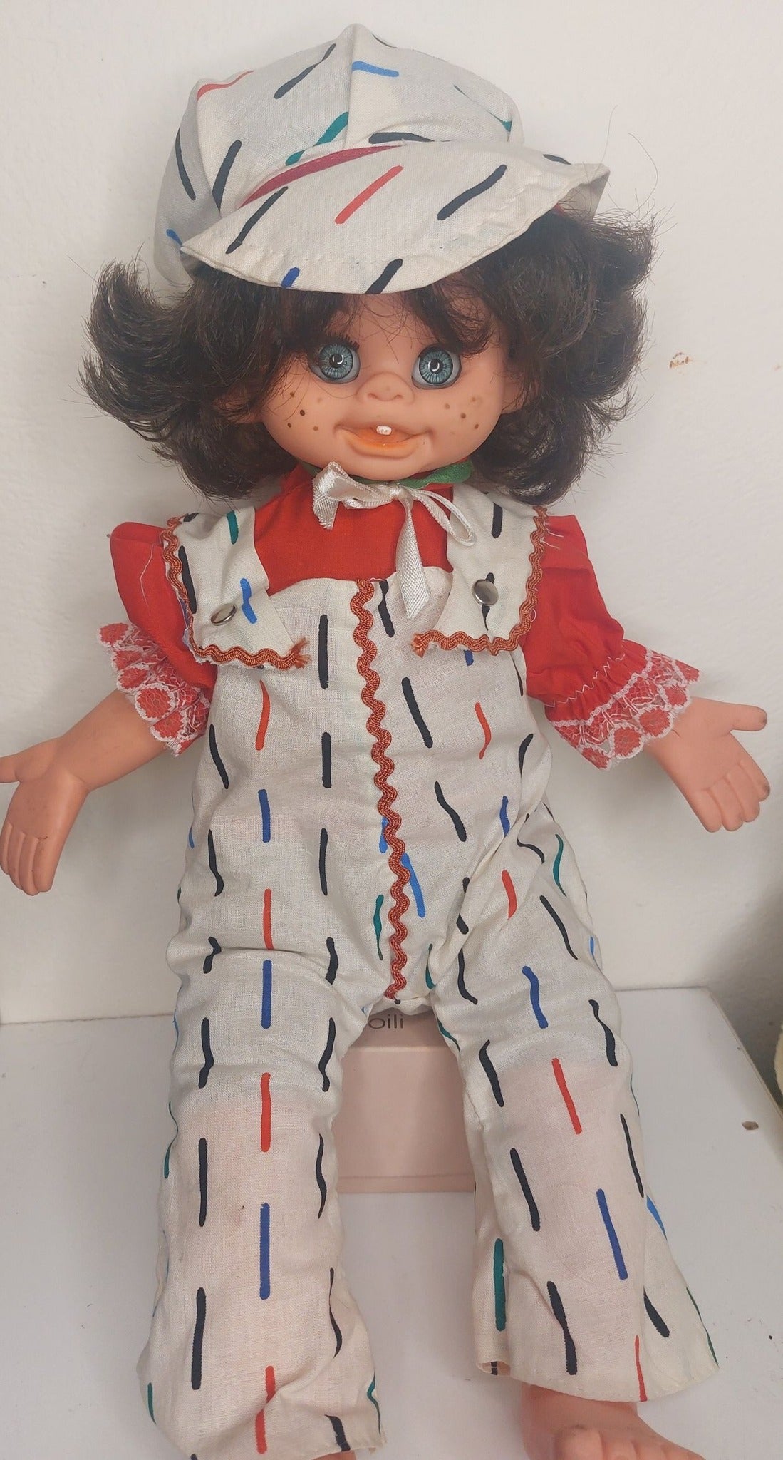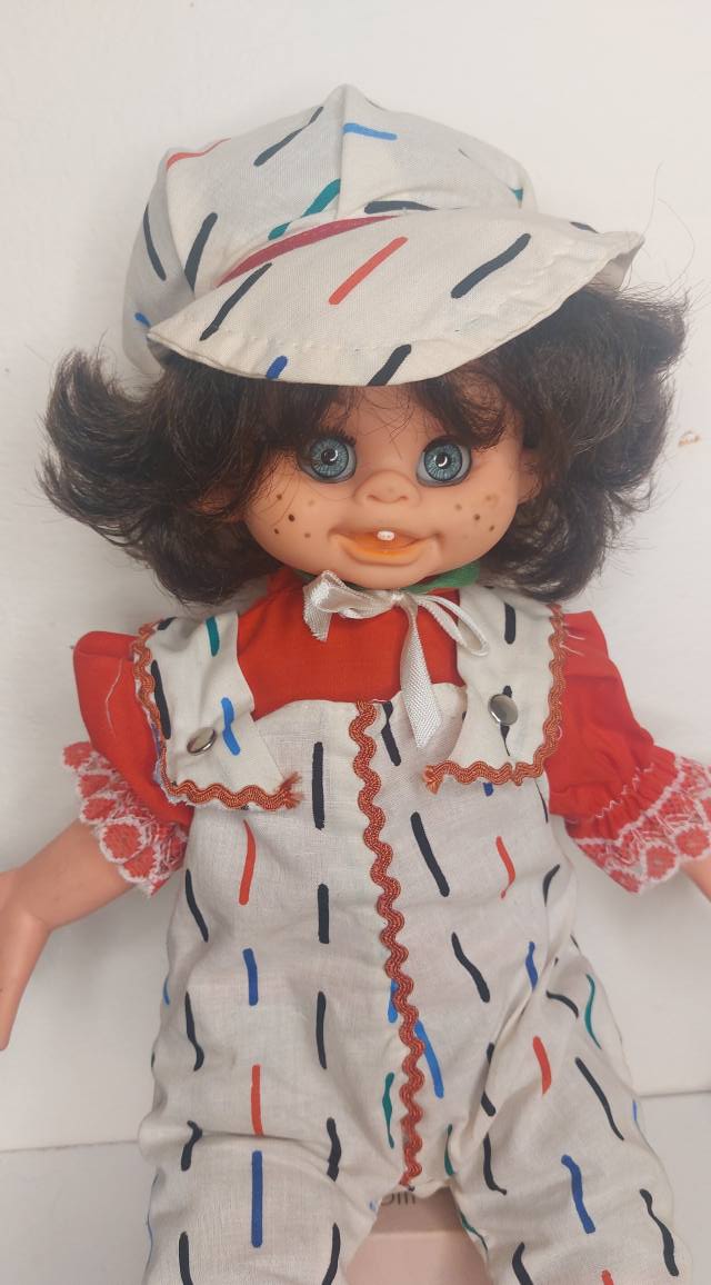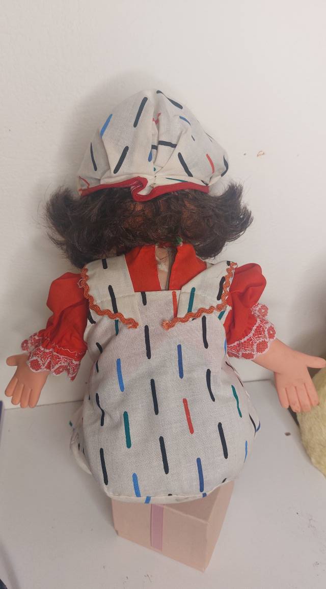 Χωρίς σφραγίδα κατασκευαστή, αλλά με πολλή γλύκα και χαρακτήρα, αυτή η κούκλα είναι μια μοναδική προσθήκη για συλλέκτες ή λάτρεις του vintage.