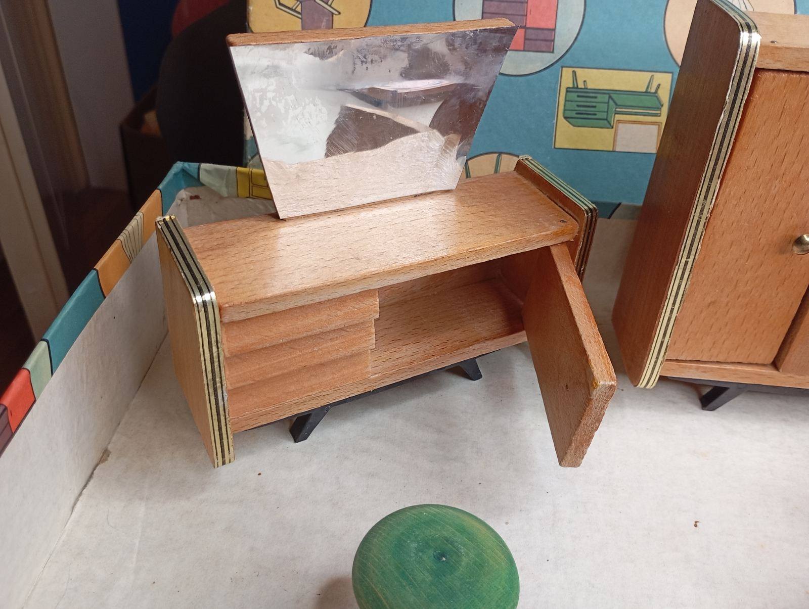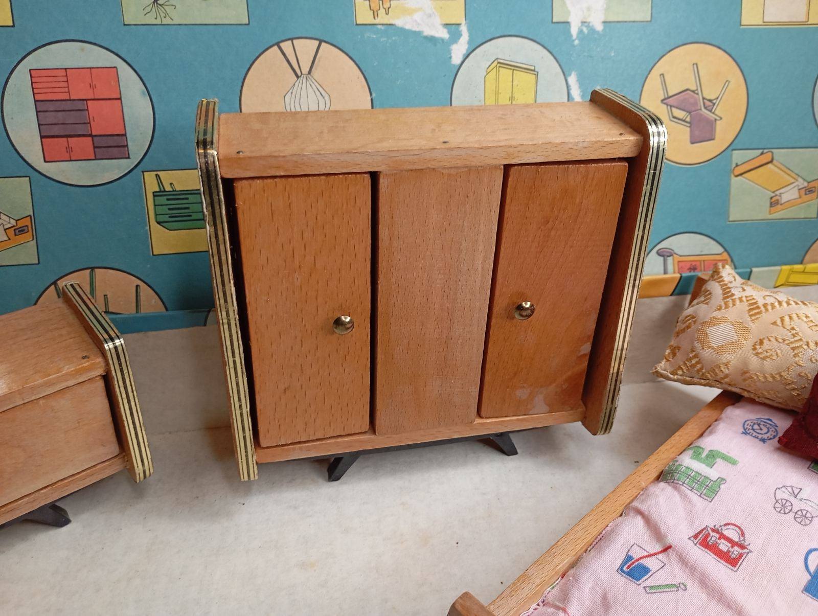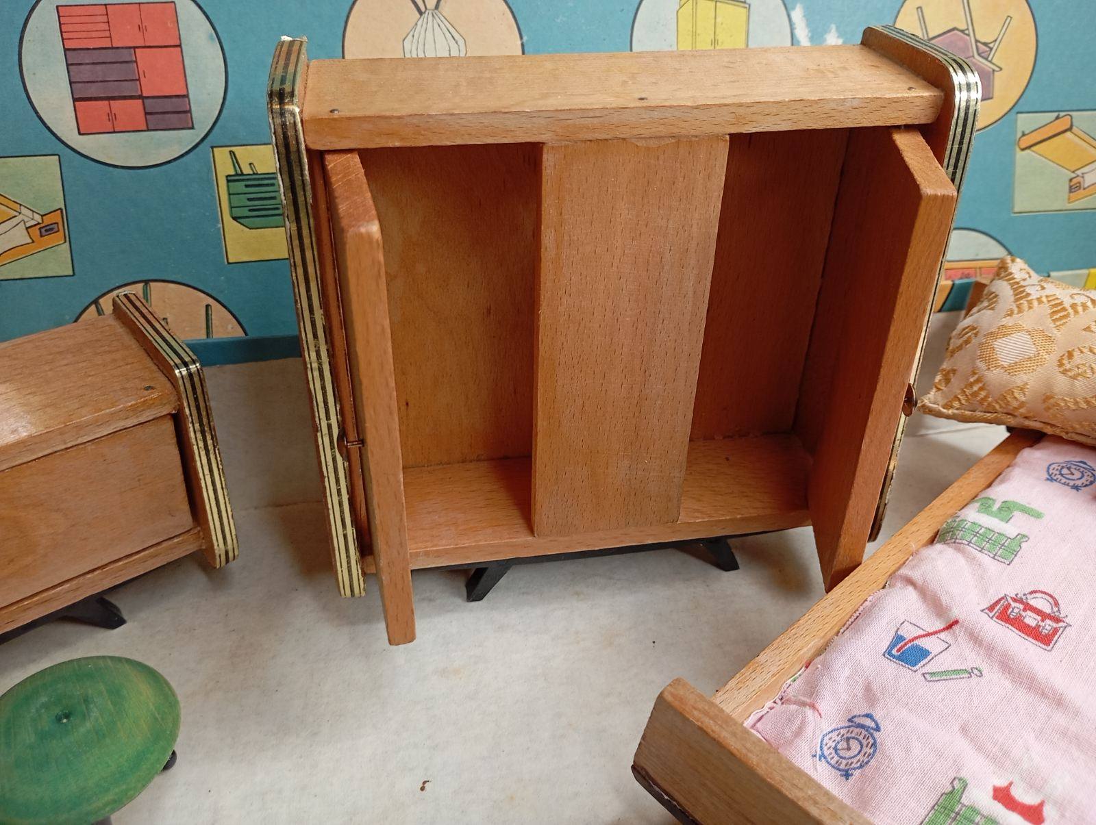 Σπάνιο και συλλεκτικό ξύλινο σετ κρεβατοκάμαρας κούκλας από τη δεκαετία του 1960–1970, ελληνικής παραγωγής. Το σετ περιλαμβάνει: