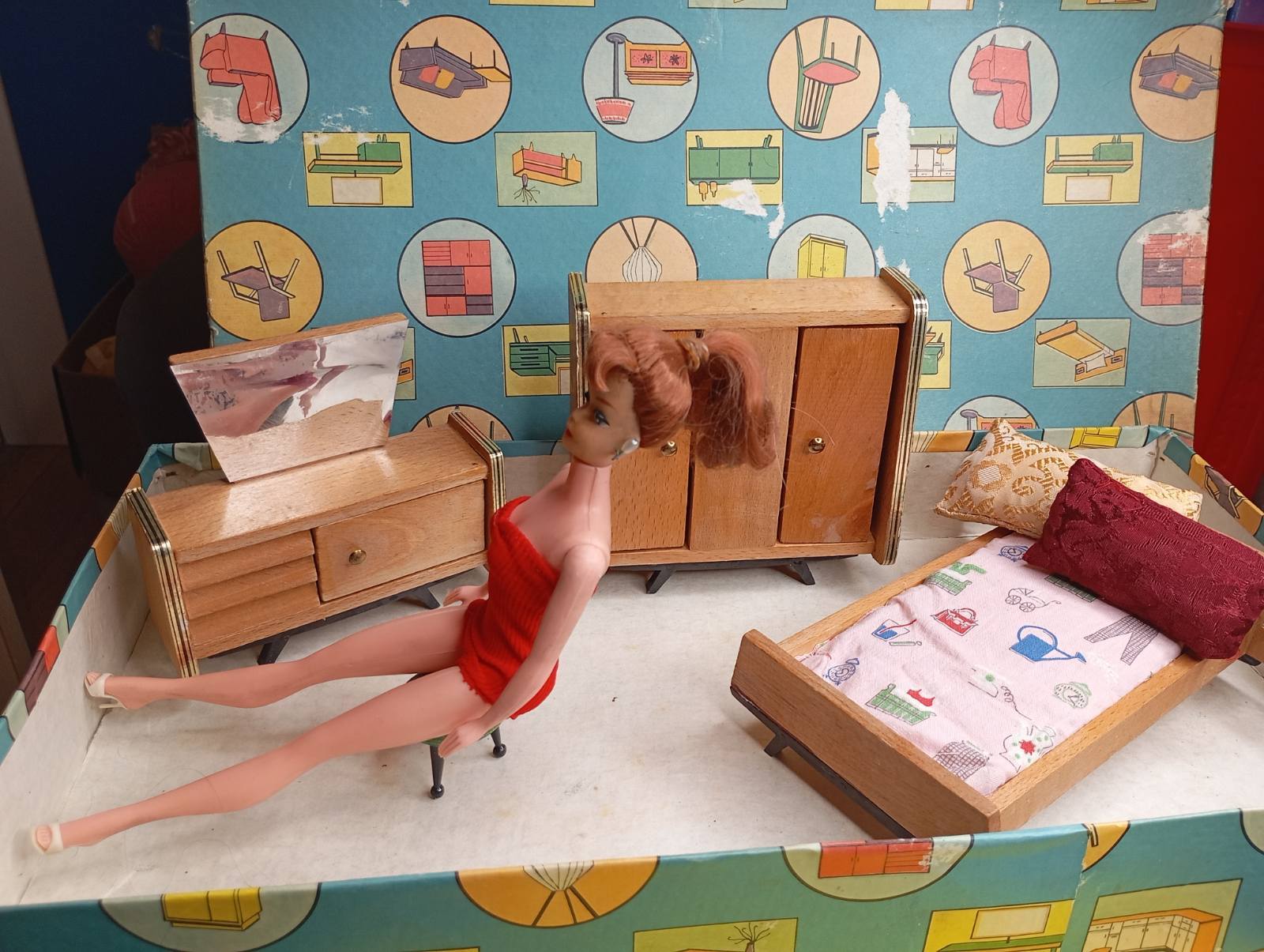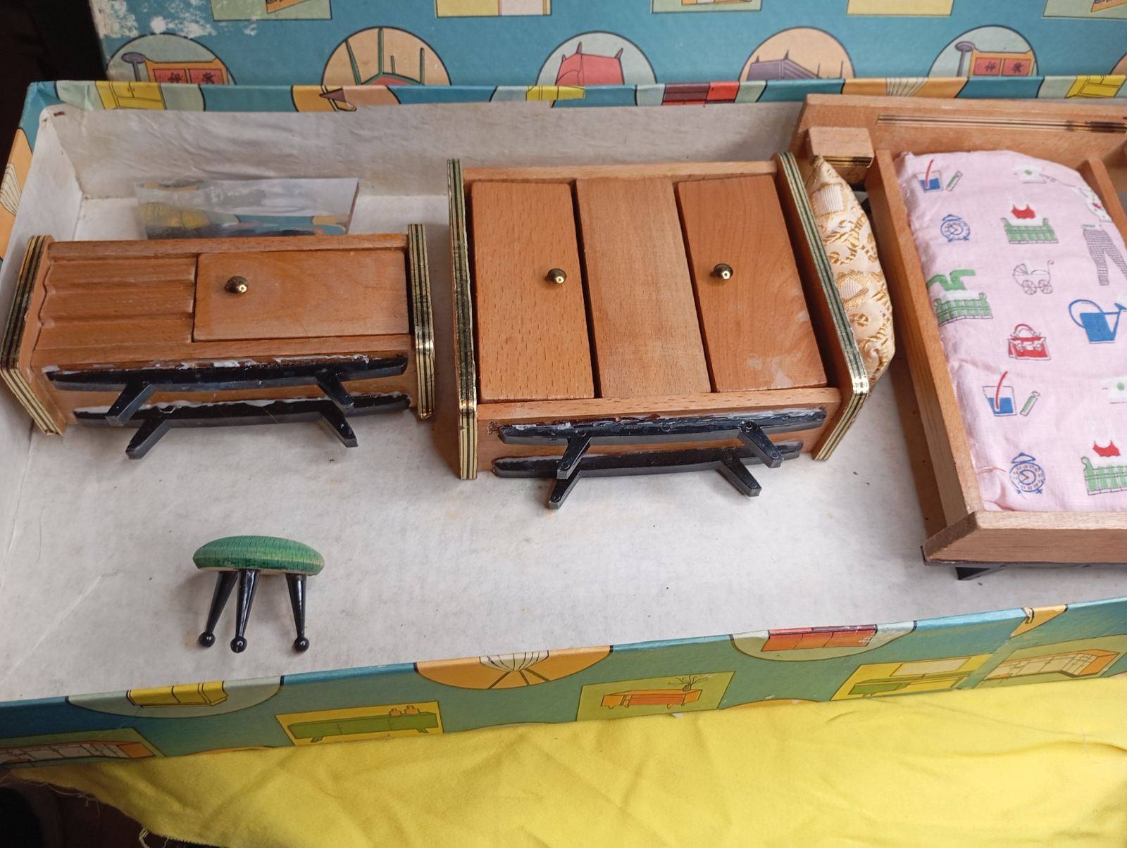 Vintage Ξύλινο Σετ Κρεβατοκάμαρας Κούκλας – 1960s/1970s – Με Κουτί